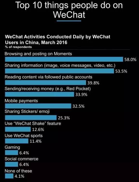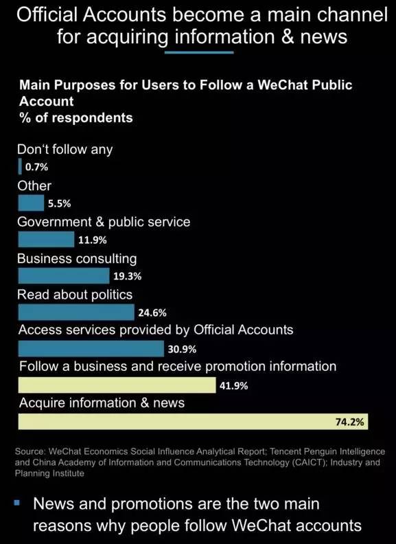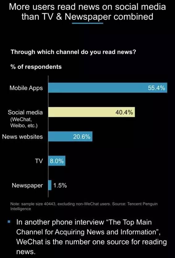 - 通过微信新闻来获取资讯的用户人数已超过使用新闻网站和电视媒体用户的总和