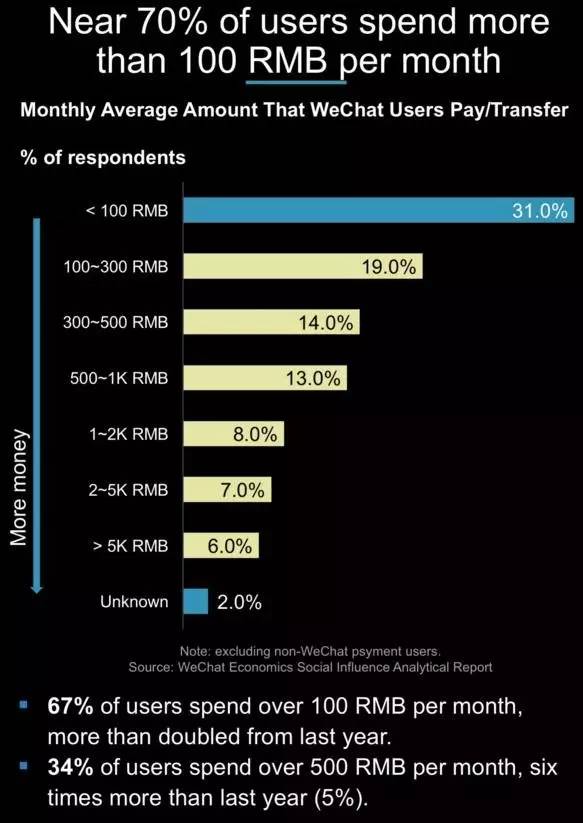 近7成用户每月转账/支付的额度超过100元,34%的用户每个月通过微信消费500元以上。不说了,老王我先去查查余额了……