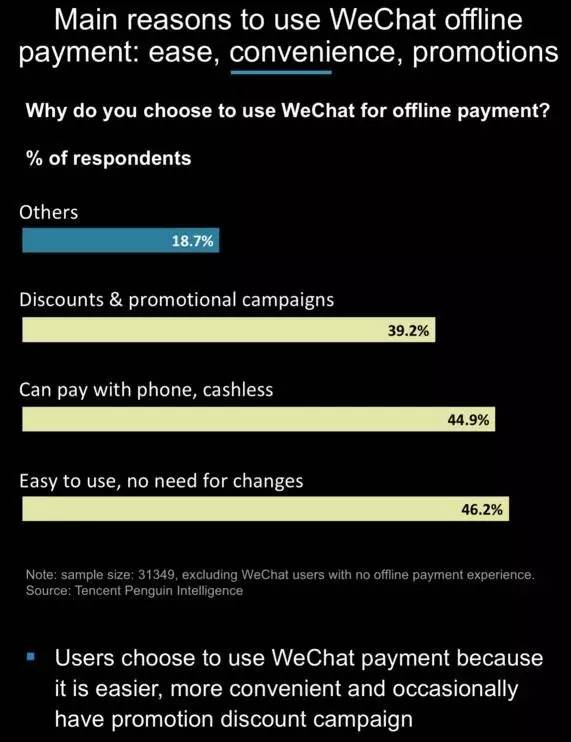 微信支付落地的三大原因是:简单、便捷、优惠,所占比例均为40%左右。用通俗的语言来说就是:告别现金找零了,不用随身带钱包了,商家经常有优惠。