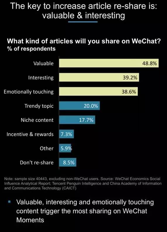 微信用户分享文章的三大原因是:有价值(48.8%)、好玩儿(39.2%)、还有情感共鸣(38.6%)。怪不得老王每次写个吐槽文都火的不要不要的,原来大家讨厌的东西都一样一样的嘛。