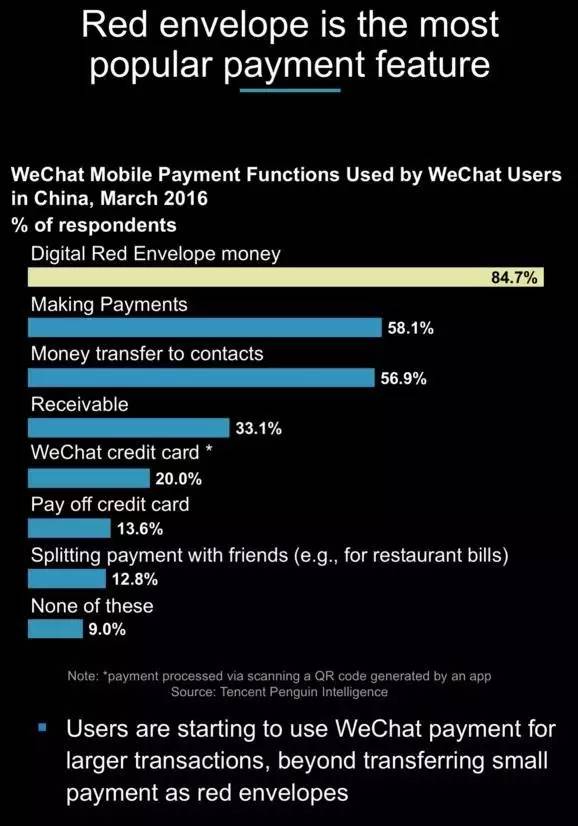 微信红包要一统天下啦!84.7%的用户都用红包付款,已经超过了微信支付和转账功能的用户数量(分别为58.1%和56.9%)。