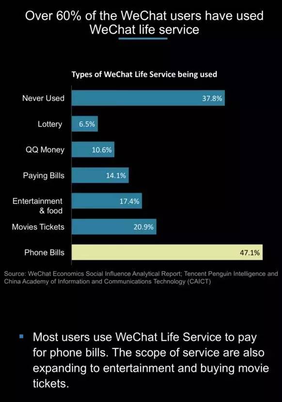 超过60%的用户使用过微信生活服务类功能。使用最多的就是手机充值功能,其次则是娱乐和电影票购买功能。这个微信生活确实普及度比较低,老王就遇见过给一桌子70后领导使用AA付款功能这么和谐的场景。