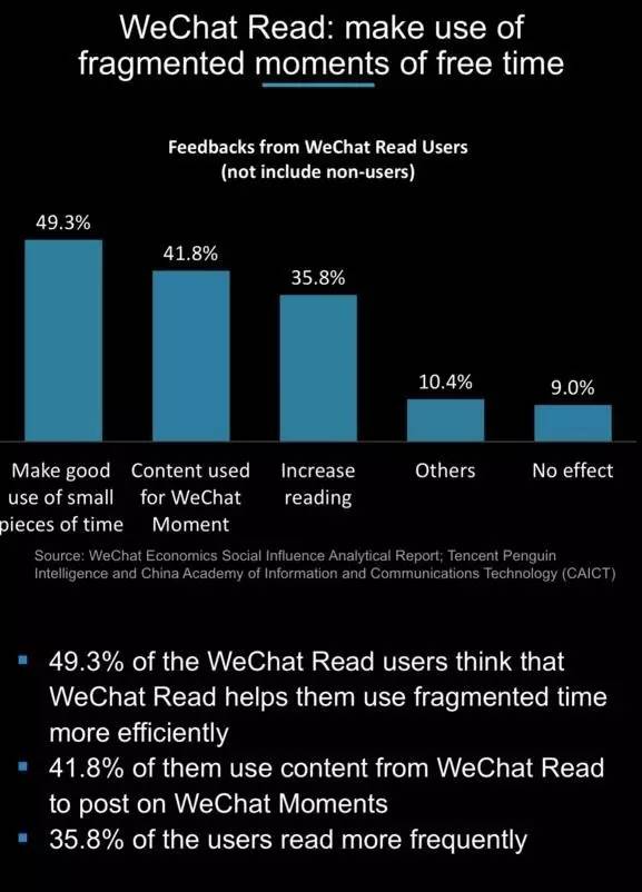 近一半的微信读书用户认为,使用后自己的碎片时间得到更充分利用。41.8%的用户因此丰富了朋友圈分享内容,35.8%的用户阅读量提升。老王承认,我书读的少,你们打我来吧……