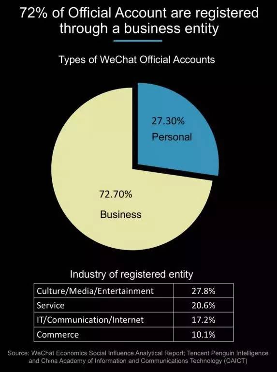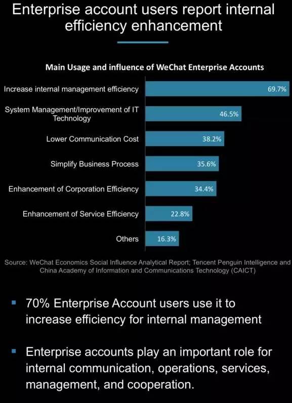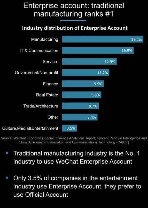 使用比例最高的是传统制造业,文化媒体行业企业号占比最低,只有3.5%,文娱类还是走平易近人的公众号路线比较受欢迎。