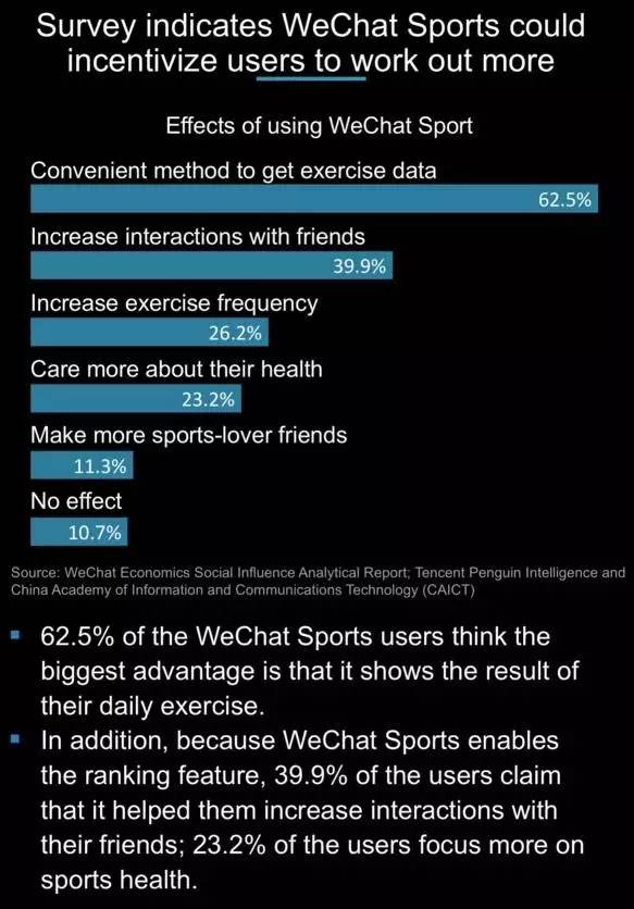 62.5%的微信运动用户认为最大的好处是方便了解每日运动量。此外,因为可以看到好友运动情况排名,39.9%的用户增加了好友互动,23.2%的用户变得更为关注运动健康。不过现在年轻人健身都靠Pokemon go呢,微信运动还得多努力一把!