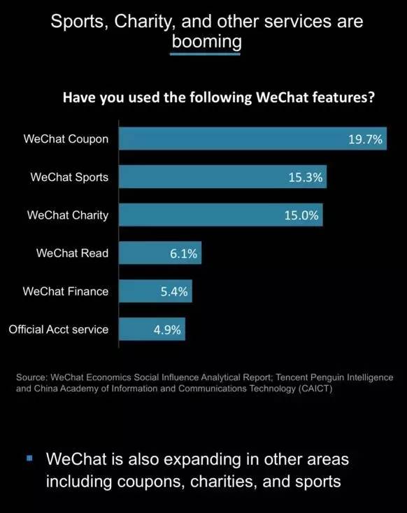 微信运动、微信慈善要开始发力啦!除了微信卡包以外,微信运动和微信慈善的使用率也不低,都达到了15%以上。