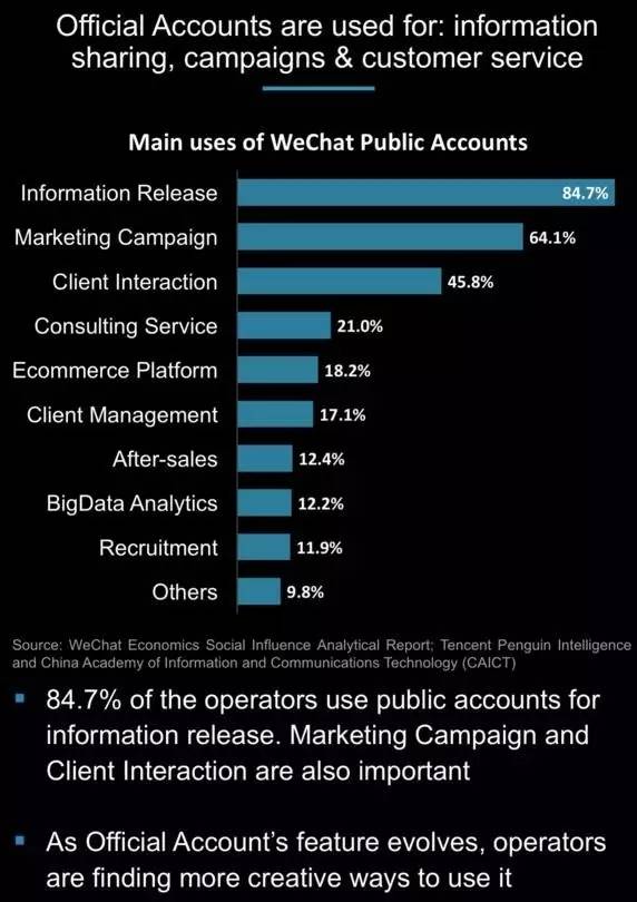 84.7%的运营者使用公众账号的主要用途是信息发布。营销宣传和客户互动也是重要的用途。随着公众账号后台的升级,运营者又可以变着花样玩儿了!