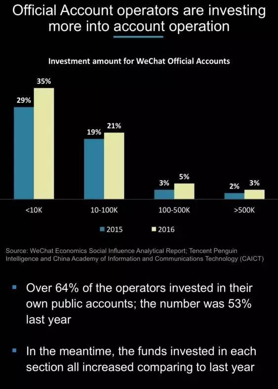 超过六成的运营者对公众平台有投资,这个比例在往年是53%。同时,各个资金区间的投入相比上年度均有提升。