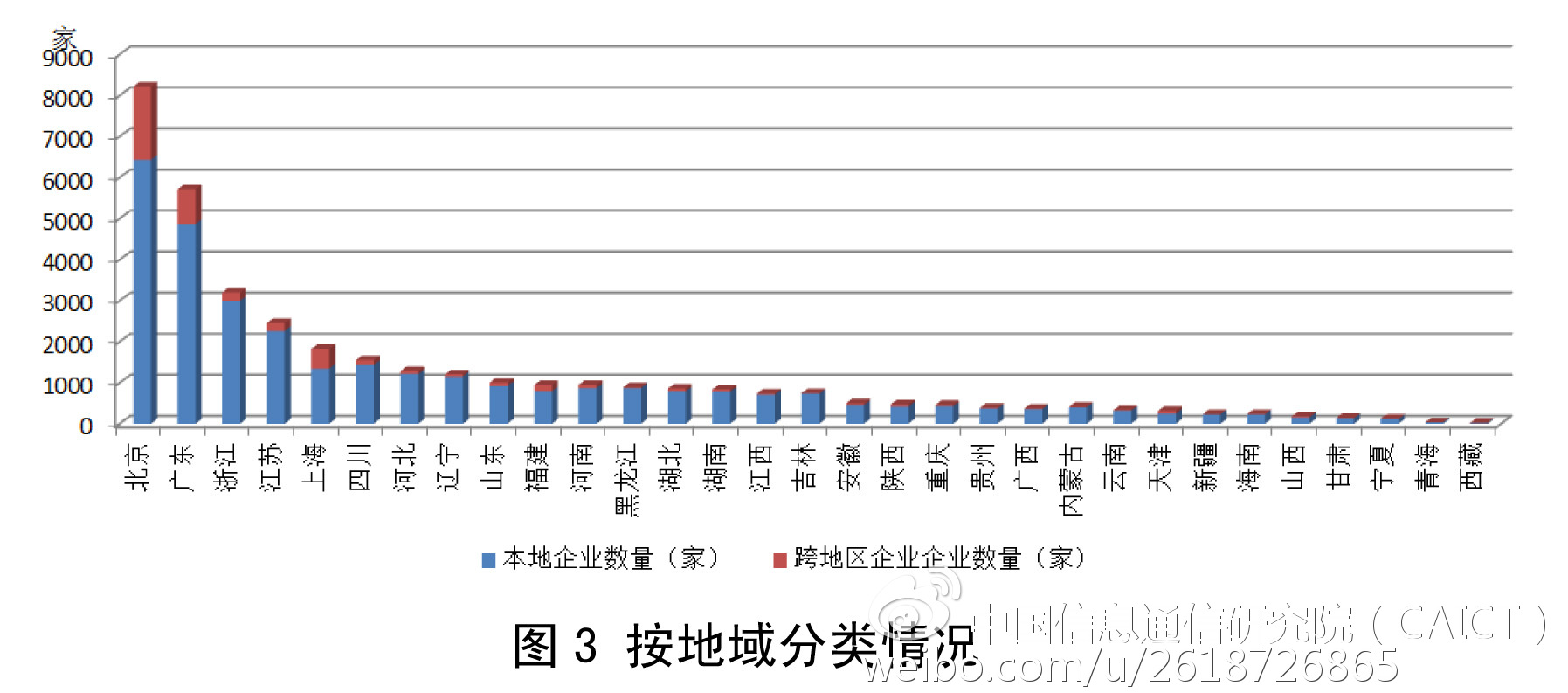 在32064家本地企业中,北京6433家,广东4864家,北京、广东两地的增值电信企业数量在全国遥遥领先,接下来依次是浙江、江苏、四川、上海等,6地集中了全国60%的增值电信企业,西部12省份的增值电信业务经营者仅占全国的12%。
