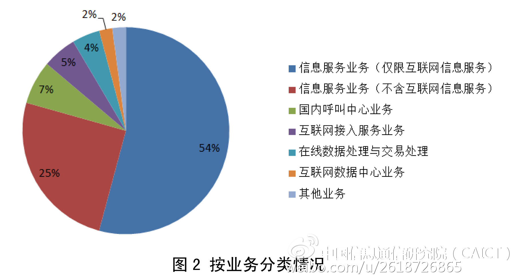 按照2015版《电信业务分类目录》中增值电信业务分类, 36631家增值电信企业合计拥有44943个许可项目。其中,24352个信息服务业务(仅限互联网信息服务),11316个信息服务业务(不含互联网信息服务),3060个国内呼叫中心业务,1950个在线数据处理与交易处理业务,2392个互联网接入服务业务,922个互联网数据中心业务,其他业务951个。
