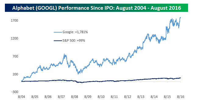 十二年过去了,谷歌从一家单纯的搜索引擎公司成长为科技界巨擘,其地位难以撼动,2014年谷歌拆过一次股,后来公司名字也改成了Alphabet。这十二年,谷歌股价飙涨1780%,同期标普500的涨幅在99%。如下图: