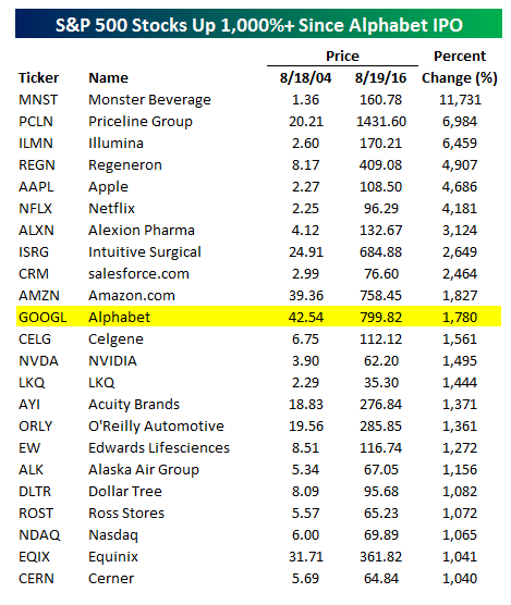 尽管谷歌的涨幅令人印象深刻,但还不是同时期表现最好的股票,甚至被挤在前十开外。来自Bespoke Investment Group的梳理: