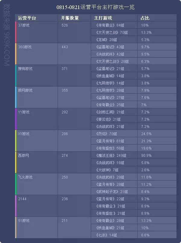 点评:本周榜单平台主打游戏与上周相比略有波动,37游戏《龙城》以5.3%的开服占比新晋为该平台的主打游戏;搜狗游戏《盗墓笔记》开服占比登顶,《决战武林》则掉出前三,老牌游戏《铁血皇城》、《九阴绝学》回归;顺网游戏《盗墓笔记》也以7.6%的开服占比顺利跻身榜单前三;其他平台的主打游戏开服基本与上周持平,未发生显著变化。