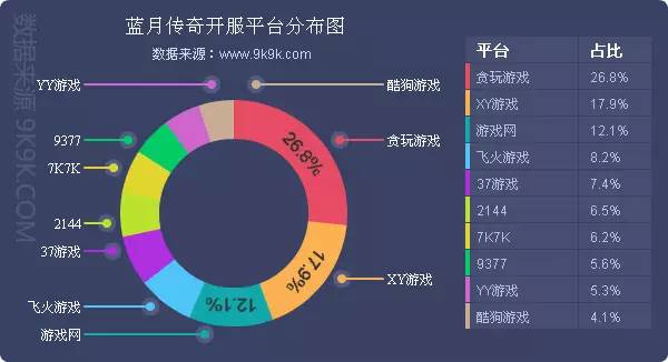 点评:《蓝月传奇》本周开服总数较上周大涨9.8%,新增分布占比平台YY游戏、酷狗游戏,开服占比分别为5.3%和4.1%。