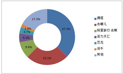 2014年中国在线旅游移动端市场 集中度较高,前四家厂商市场份额达 到77.1%。 其中,携程、去哪儿市场份额居 于领先地位,分别为37.3%和25.1%; 阿里旅行•去啊、活力天汇(航班管家 和高铁管家)、艺龙处于第二梯队, 市场份额分别为9.6%、5.1%和3.7%; 预计移动端在中国在线旅游市场战略地位已十分凸显,主要在线旅游厂商均大规模进 行移动端投入,移动端市场格局与PC 端趋于一致。