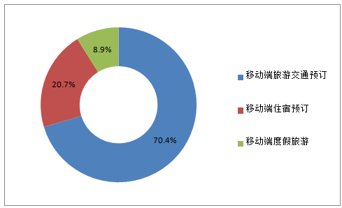 2014年中国在线旅游移动端市场 中,移动端旅游交通预订市场规模最 大,份额达70.4%,其次为移动端住 宿预订和移动端度假预订。旅游交通预订产品主要由机票构成,机 票产品标准化程度高,20世纪90年代 已形成成熟全球电子分销系统,因此 最早开始互联网化进程,并极易复制 到移动端平台,同时,高客单价和规 模庞大的出行人数使机票预订维持较 大的市场规模。
