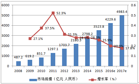 2014年中国在线旅游市场交易 规模达到2798.2亿元人民币,较 2013年增长28.3%。 预计中国在线旅游市场规模趋于稳定增长, 预计2017年市场规模达到4983.4亿 元人民币,较2014年增长78.1%。