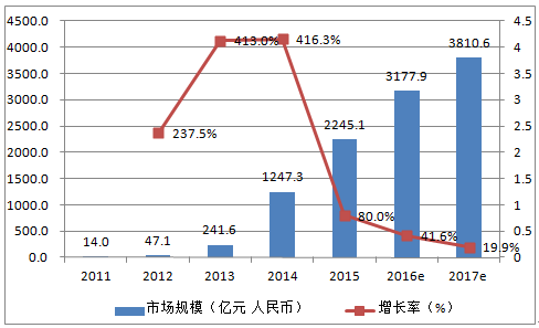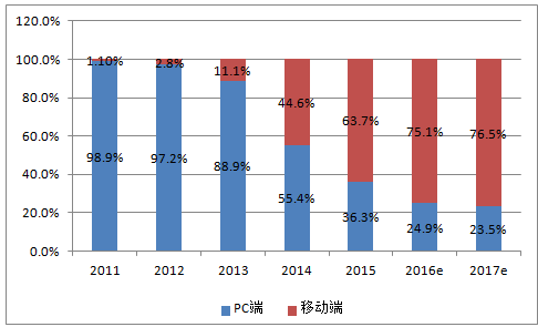 2012年至2014年中国移动互联网呈现爆发式增长,带动中国在线旅游移动端市场规模迅速扩大,2014年市场规模达到 1247.3亿元人民币,2015年后增速将逐渐放缓,预计2017年达到3810.6亿元人民币;中国在线旅游移动端占比逼近PC端,2015年将超过PC端,达到63.7%,预计2017年移动端占比达到76.5%。