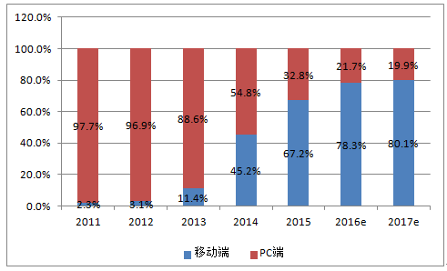 移动端的实时性和便捷性使用户随时随地享受在线预订服务。预订行为从旅行前拓展到旅行中,效率更高,同时用户移 动端活跃程度也逐渐超过PC端,2014年第2季度开始,移动端人均单日访问时长持续高于PC端,且差距持续扩大; 2015年移动端市场规模将超越PC端,达到67.2%,预计2017年达到80.1%;同时,随着移动端发展进入稳定增长阶段, 移动端对PC端的挤压作用将减小,移动端市场交易规模的增长将由PC端消费迁移转变为内生增长驱动模式。