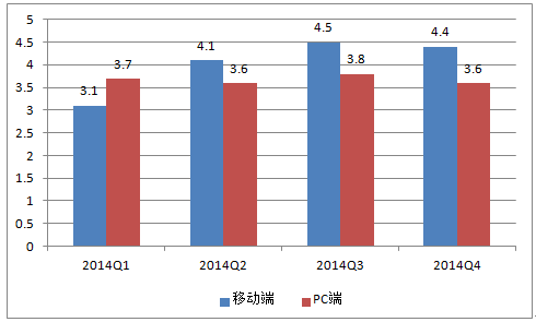 2014Q1-2014Q4中国在线旅游市场各平台人均单日访问时长