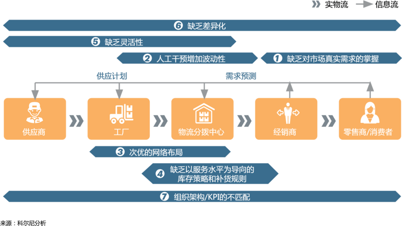 据科尔尼公司的报告《消费品市场中的与时俱进》,在这种推动模式下,中国消费品的在供应链设计与执行方面存在以下七个问题: