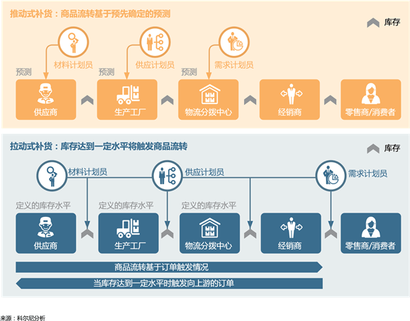 拉动模式的最终拉动力来自于终端零售市场。中间经销商订单不能100%地反映零售市场的需求,而且经销商有很多动机歪曲终端市场的需求表现。所以,终端市场销售数据的可见性非常关键。此外,在拉动模式中,库存战略发挥着重要的作用。零库存(JIT)生产在消费品行业中并不常见。恰当的产品、存放在恰当的库存地点、恰当的库存水平以及恰当的补货机制有助于优化供应链上游的经济性,并应对市场需求的波动。