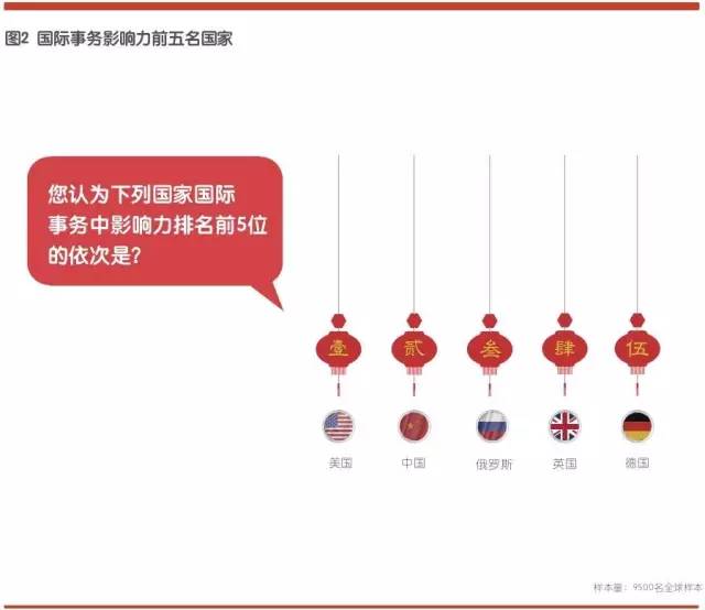 美国在国际事务中影响力占据首位,中国位居第二,其后依次是俄罗斯、英国和德国。