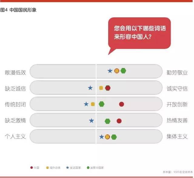 在海外受访者中,认为中国国民勤劳敬业的受访者最多,其次是集体主义、热情友善和诚实守信。发达国家有一定数量的受访者认为中国国民偏向传统封闭,缺乏开放创新。