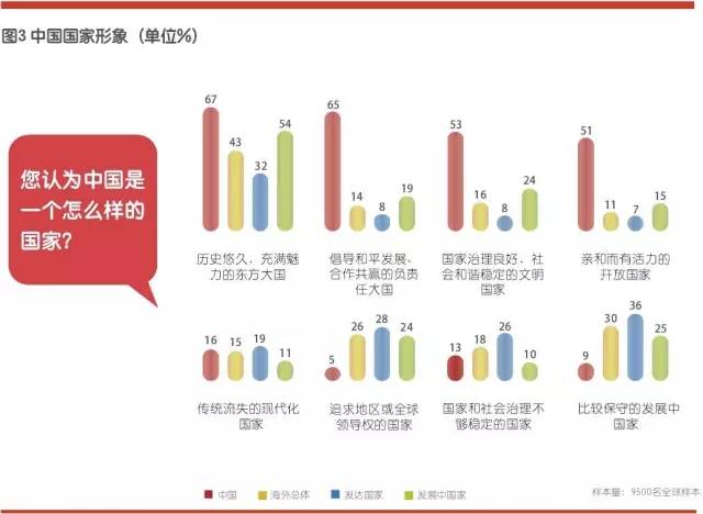 在海外受访者的印象中,中国历史悠久、充满魅力的东方大国形象最为突出,选择该选项的受访者例达到43%,其中发展中国家的选择比例更是高达54%。