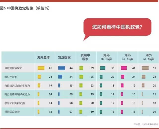 分年龄来看,“有自我约束和净化能力”、“学习和创新能力强”、“得到民众支持”的形象更为得到海外年轻群体的认同;“具有高度凝聚力”、“组织严密和“有超强组织动员能力”的形象则更多地被海外年长群体所认同。