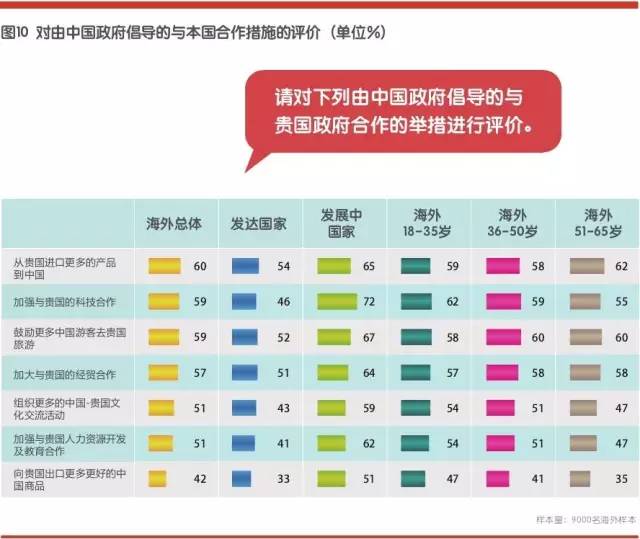 由中国倡导的合作举措受到了海外受访者的普遍认可