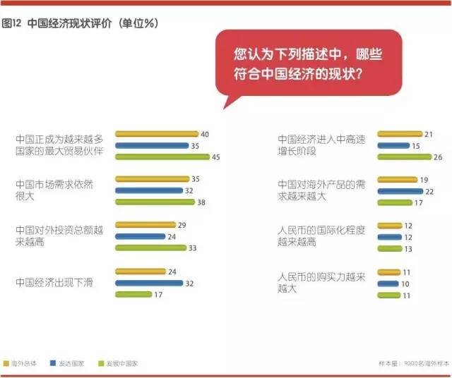 谈及中国经济的现状,40%的海外受访者认为“中国正在成为越来越多国家的最大贸易伙伴”;35%的受访者认为“中国市场需求依然很大”;29%的受访者认为“中国对外投资总额越来越高”。