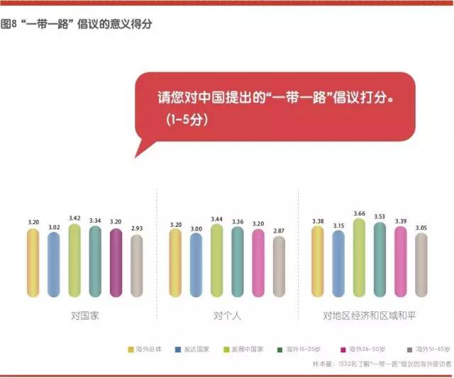 从受访者对“一带一路”倡议的评价来看,该倡议对国家、个人、地区经济和区域和平都具有积极意义。尤其是发展中国家受访者对该倡议的认可度更高。分年龄看,年轻群体更认可“一带一路”倡议的效果。
