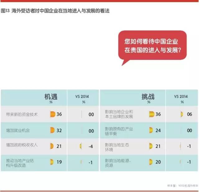 挑战方面,36%的受访者认为中国企业会影响当地企业和本土品牌的发展,且这个比例相比2014年高出6个百分点; 24%的受访者认为会影响原有产业链平衡。