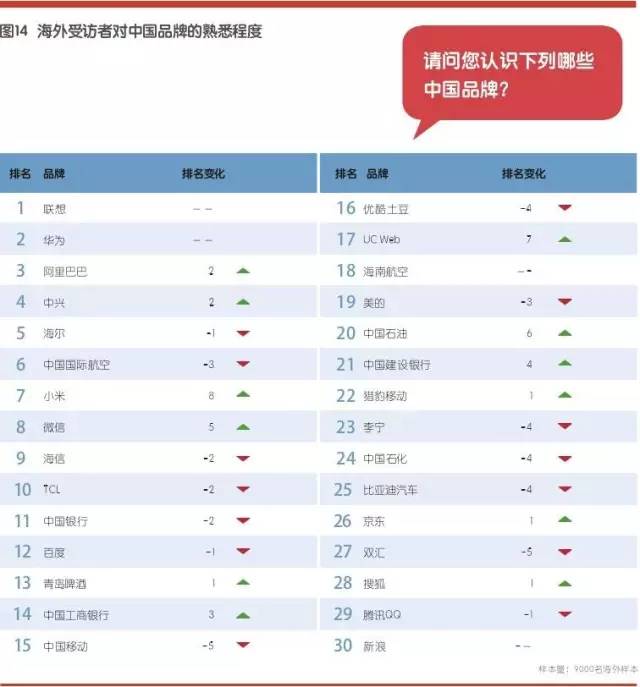 从海外受访者的熟悉程度来看,排在前五位的品牌依次为联想、华为、阿里巴巴、中兴和海尔。与2014年相比,小米、微信、UC浏览器等科技品牌的熟悉度排名有明显的提升,此外中国石油的排名也有较大幅度的上涨。