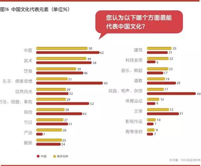 谈及中国文化的代表元素,海外受访者认为中医、武术和饮食最具代表性,选择比例分别为50%、49%和39%。