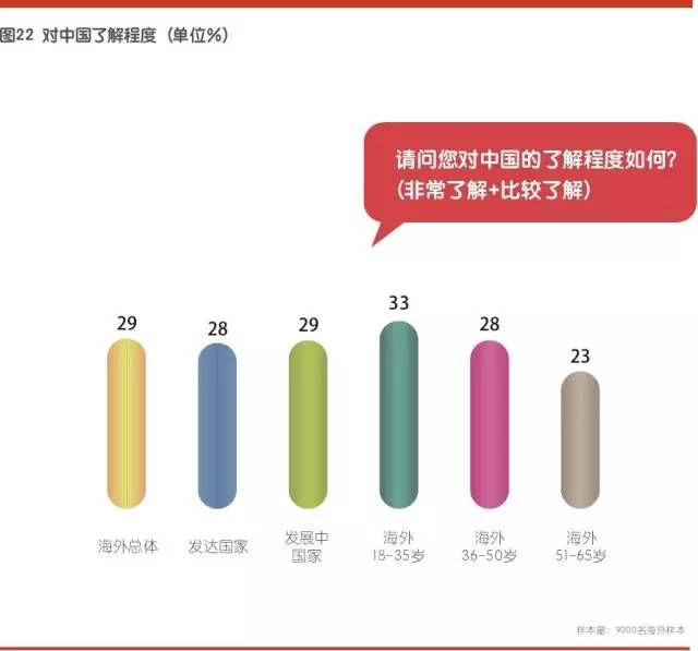 在对中国的了解程度方面,29%的海外受访者选择了“比较了解”或“非常了解”,这个比例高于2014年。在这些受访者中,年轻群体更为了解中国。
