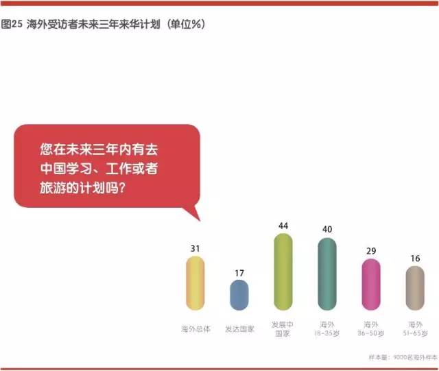 2015年海外受访者中,未来三年内有计划来中国学习、工作或旅游的比例占到31%,高于2014年的26%。