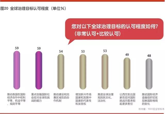 全球受访者中认可“推动各国在国际经济合作中权利平等、机会平等、规则平等”和“重点加强国际社会应对全球性挑战的能力”是全球治理目标的比例最高,均为59%;“推动建设和完善区域性的合作机制”,“增加新兴市场国家和发展中国家的代表性和发言权”和“推进全球治理规则民主化、法治化”也同样有着较高的支持率。