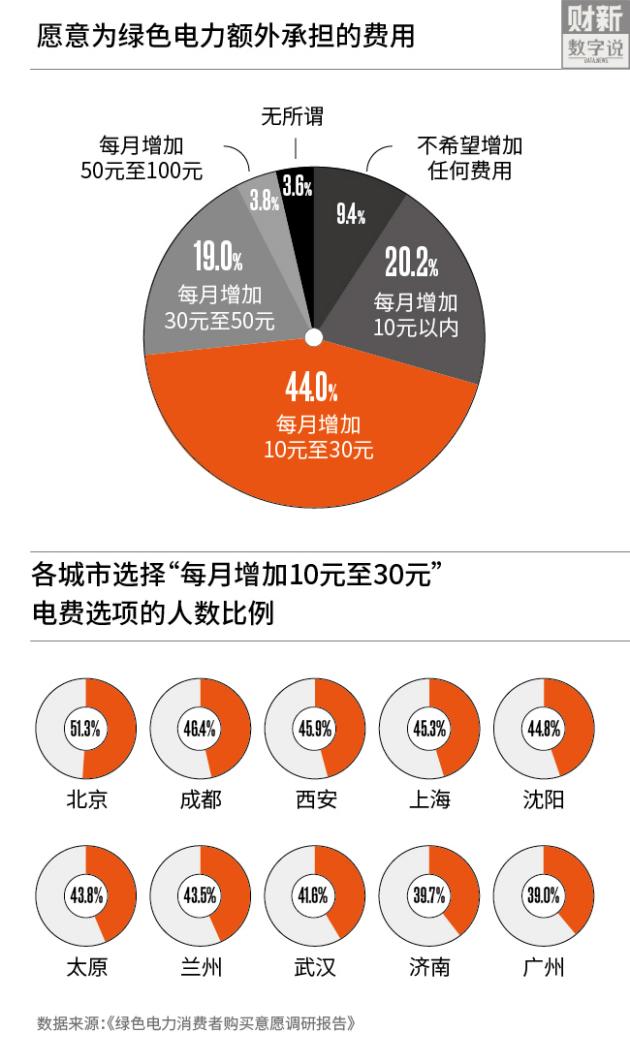 愿意购买绿色电力的受访者中,接受每月增加10元至30元的电费的人数最多,占44%。