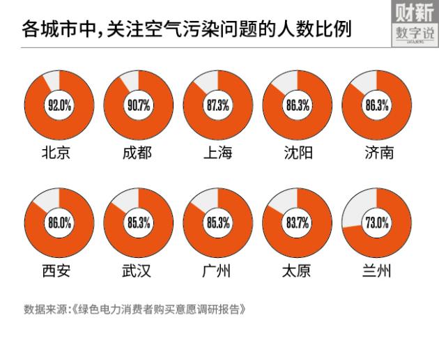 根据《报告》,对环境污染问题表示关心的被访者均占九成以上,其中,广州比例最低。在环境问题中关注率最高的是空气污染。北京关注空气污染问题的人群比例为92%,明显高于其他城市,与其相对的是兰州公众对空气污染关注比例仅为73%。