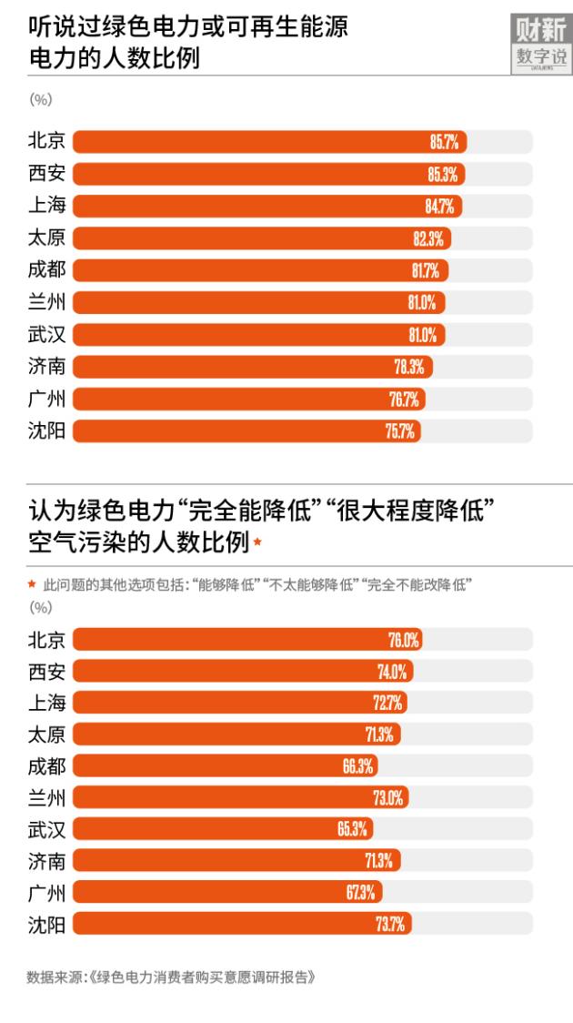 不同城市公众对于绿色电力或可再生能源的知晓率有一定差异:北京达到85.7%,广州的知晓率相对偏低。在各个城市中,对于绿色电力能否降低空气污染的看法,以北京为代表的北方城市的信心普遍强于南方城市。