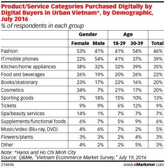 越南市场调研机构Q&Me的7月报告数据显示,越南城市的互联网消费者正逐渐在网上购买时装、科技产品和家电。胡志明市46%的受访者网购过服装,39%的人称买过电子产品和手机。