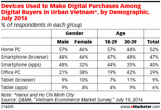 至于网购的设备,越南消费者通过电脑或者手机购物。52%的受访者通过电脑购物,47%的人使用手机网页购物,40%的人通过app。