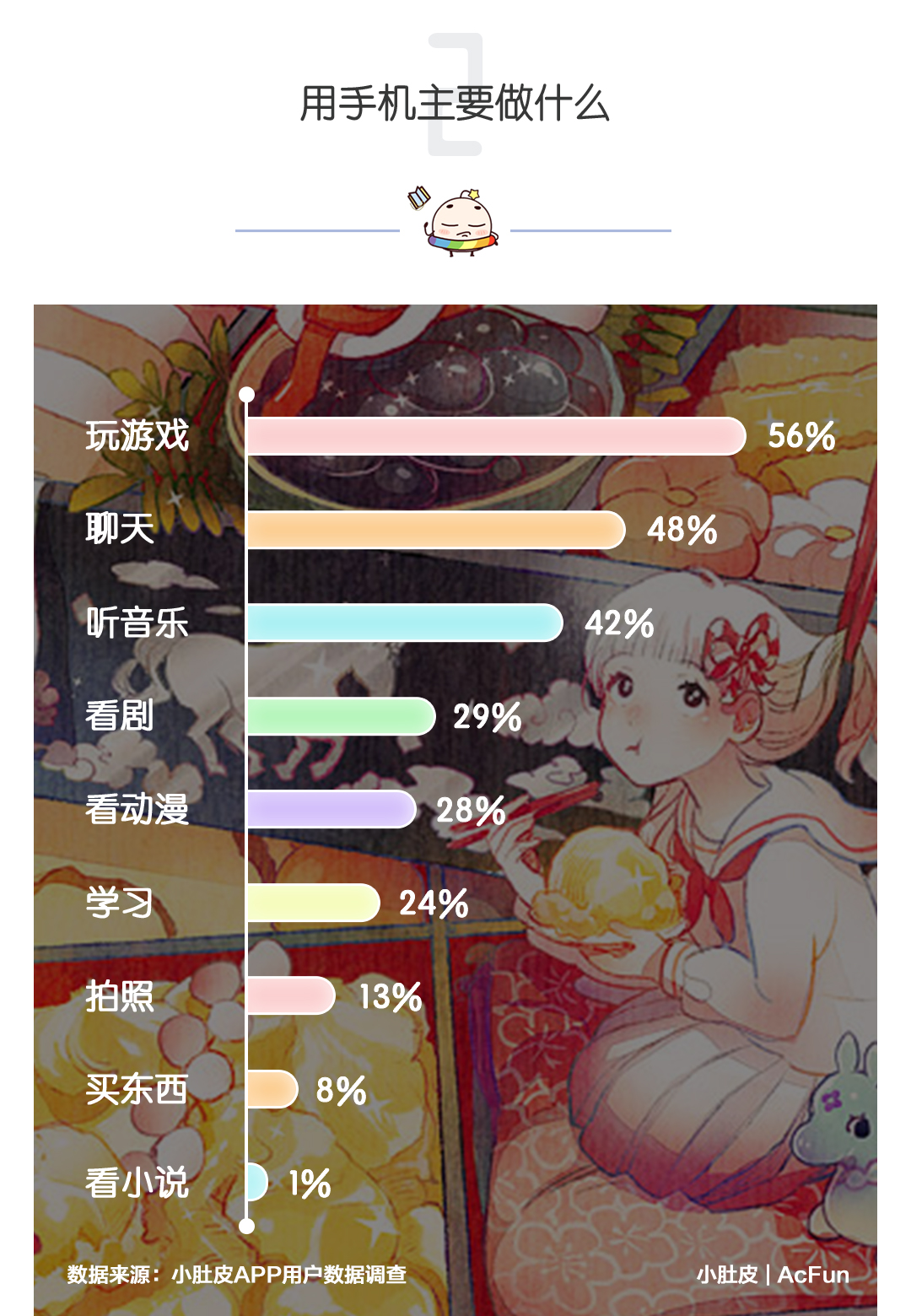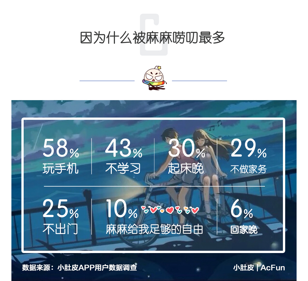 由数据可见,手机们在00后的暑假生活中主要是游戏担当和聊(liao)天(sao)担当。当然,听音乐看动漫看剧也是少不了的!除此之外,超过20%的一部分好孩子表示,我们用功着呢!手机只是我们用来学习的工具而已!