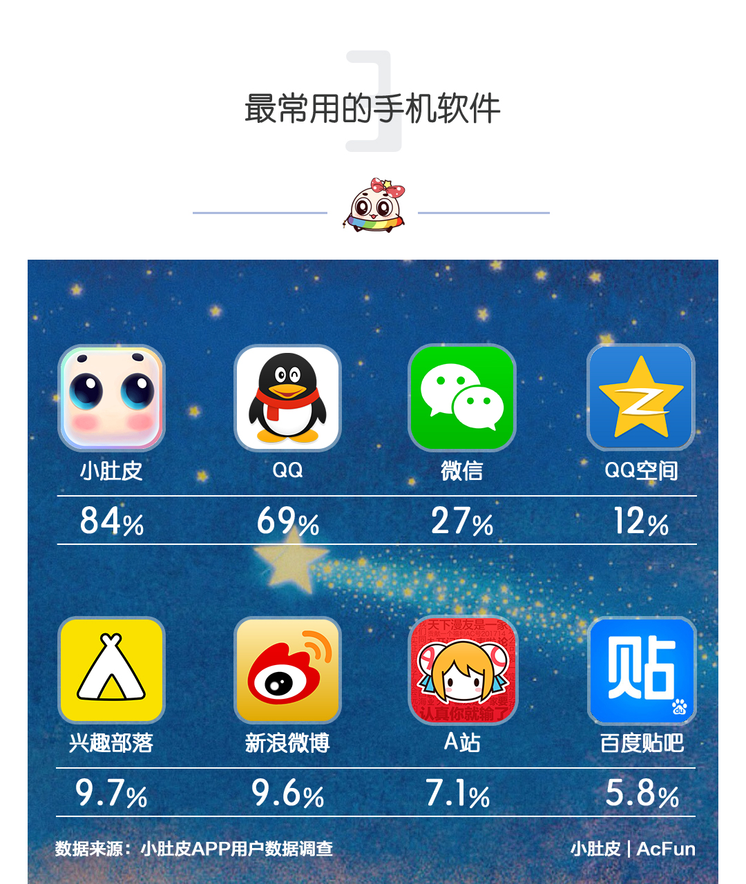 因为是在小肚皮做的调查问卷吧,小肚皮竟然受(li)宠(suo)若(dang)惊(ran)地成了第一名!打败了千年不败的QQ君…虽然QQ君暂居第二,但其以69%的占比完爆了第三名的微信君(27.24%)和剩下的各位。由此可见,QQ依旧是少年少女们的真爱。