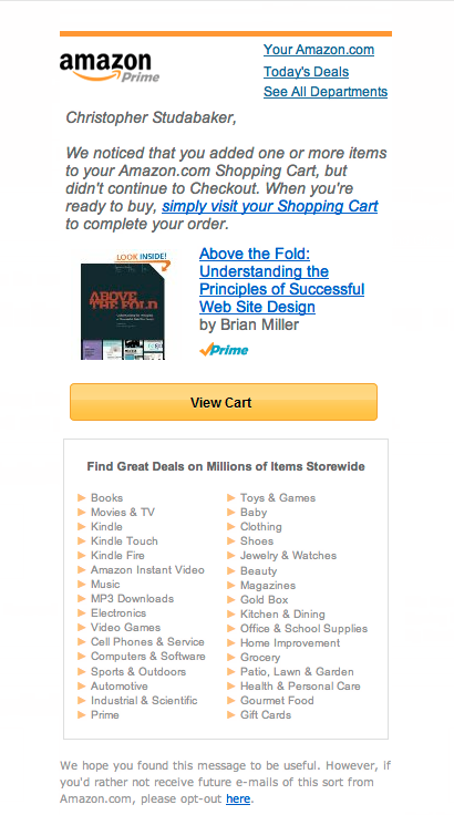 很多人都有过将商品先放入购物车,随后却没有购买也没有从购物车中删除的经历。亚马逊通过下图这种提醒邮件刺激购买。