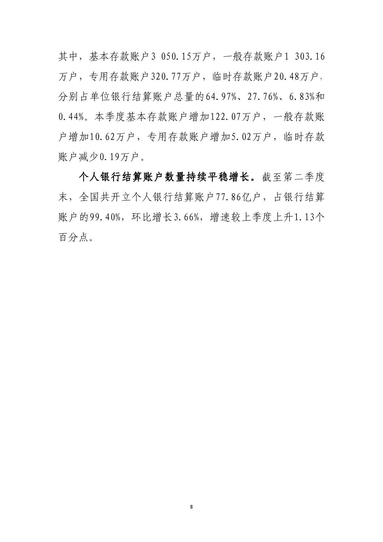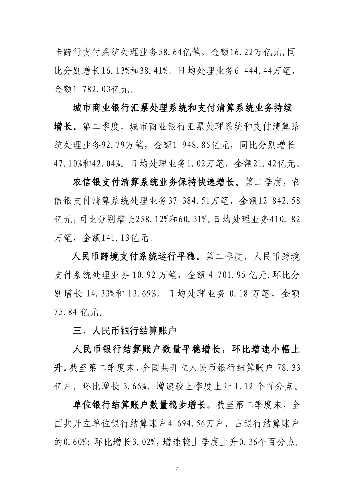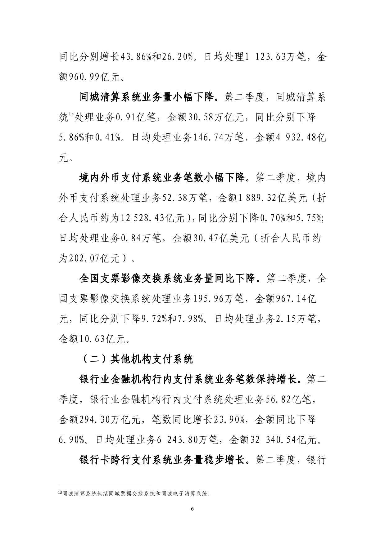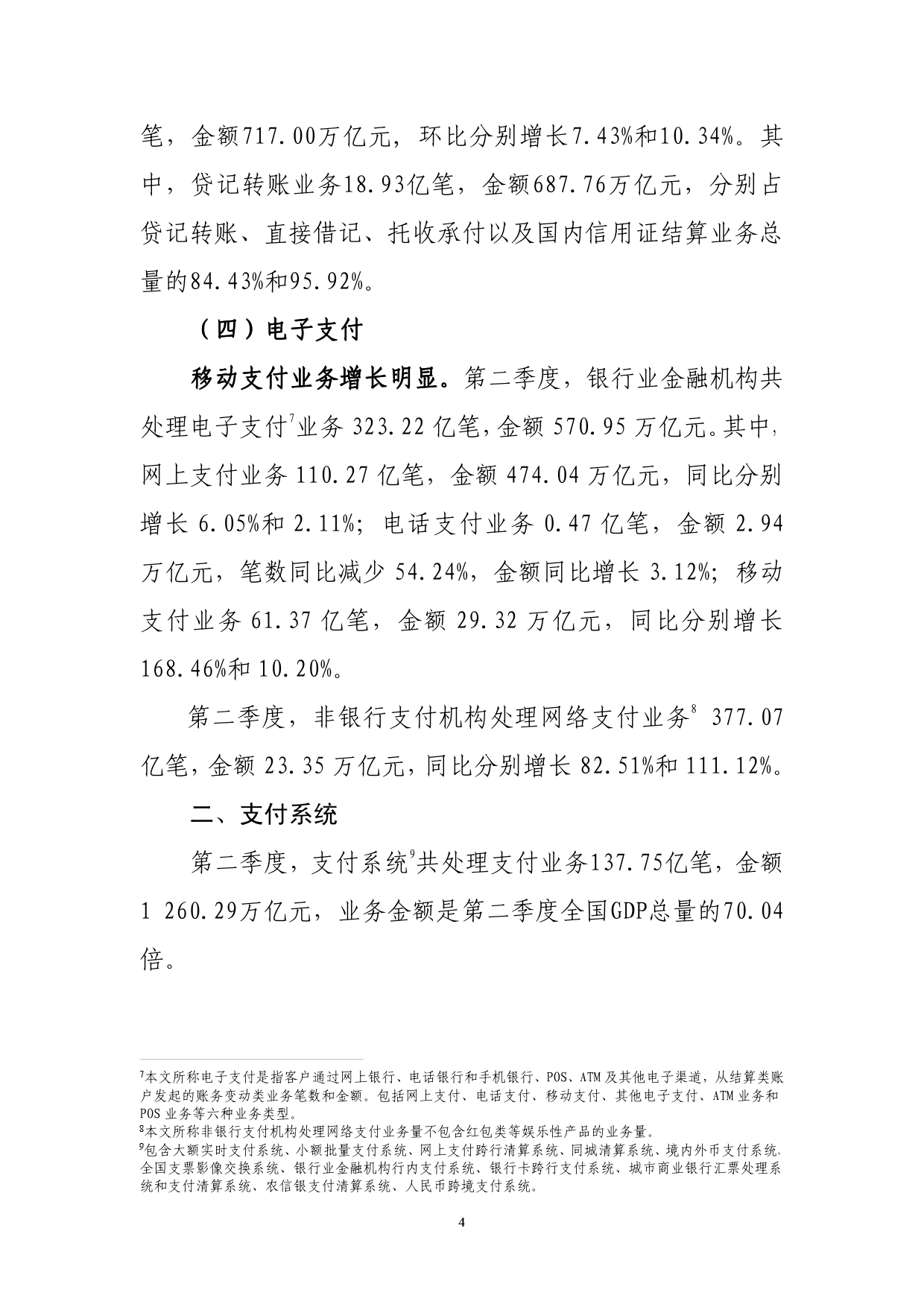 第二季度,全国共办理非现金支付业务278.89亿笔,金额940.26万亿元, 同比分别增长21.23%和10.26%。呈现出票据业务持续下降,电子商业汇票系统贴现、转贴现业务增长较快,银行卡信贷规模继续增长,移动支付业务增长明显等特点。