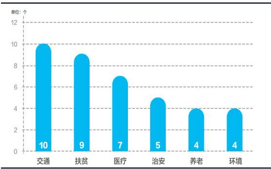 交通拥堵、看病难、食品安全、教育资源不均衡等民生问题,已成城市发展瓶颈。政府从不同侧面切入,利用大数据手段解决民生问题。其中涉及交通方面的大数据项目居多,其次为大数据扶贫项目。
