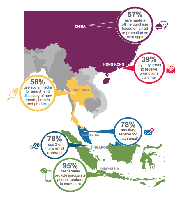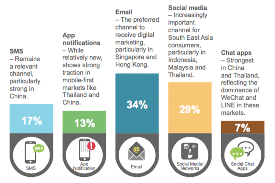 这份报告详细描述了消费者在研究、查找、互动以及购买产品和服务方式上的显著差异。这些差异存在于各种渠道(短信、应用通知、电子邮件、社交媒体、聊天软件)、设备(智能手机、功能手机、Wi-Fi/蜂窝平板电脑、可穿戴设备)和内容(电子邮件广告、手机应用广告、社交媒体广告、网络视频广告和搜索广告)中。调查结果突出显示了要通过诸多渠道来覆盖亚洲数字消费者的复杂性,但是也强调了其重要性。